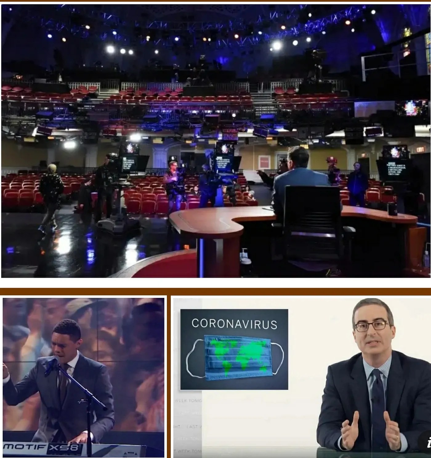 In the past week I’ve watched a traumatised Stephen Colbert dealing with his empty seats by doing a rambling monologue crutched on alcohol and way more reliance on LIVE music than usual. https://www.youtube.com/watch?v=aKhPbVN_Rbw